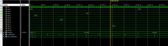 LIBRARY ieee; USE ieee.std_logic_1164.all; --按键编码模块 ENTITY key_code IS PORT ( clk : IN STD_LOGIC;--时钟 reset : IN STD_LOGIC;--复位 key_1 : IN STD_LOGIC;--1号抢答按键 key_2 : IN STD_LOGIC;--2号抢答按键 key_3 : IN STD_LOGIC;--3号抢答按键 key_4 : IN STD_LOGIC;--4号抢答按键 key_5 : IN STD_LOGIC;--5号抢答按键 key_6 : IN STD_LOGIC;--6号抢答按键 key_7 : IN STD_LOGIC;--7号抢答按键 key_8 : IN STD_LOGIC;--8号抢答按键 key_9 : IN STD_LOGIC;--9号抢答按键 key_10 : IN STD_LOGIC;--10号抢答按键 valid : OUT STD_LOGIC;--按键按下 number : OUT STD_LOGIC_VECTOR(3 DOWNTO 0)--按下序号 ); END key_code; ARCHITECTURE behave OF key_code IS signal key_in:STD_LOGIC_VECTOR(9 DOWNTO 0); BEGIN valid <= key_1 or key_2 or key_3 or key_4 or key_5 or key_6 or key_7 or key_8 or key_9 or key_10; key_in <= key_1 & key_2 & key_3 & key_4 & key_5 & key_6 & key_7 & key_8 & key_9 & key_10; PROCESS (key_in, reset) BEGIN IF (reset = '1') THEN--复位 number <= "0000"; ELSE case key_in is when "1000000000" =>number <= "0001";--按键1按下 when "0100000000" =>number <= "0010";--按键2按下 when "0010000000" =>number <= "0011";--按键3按下 when "0001000000" =>number <= "0100";--按键4按下 when "0000100000" =>number <= "0101";--按键5按下 when "0000010000" =>number <= "0110";--按键6按下 when "0000001000" =>number <= "0111";--按键7按下 when "0000000100" =>number <= "1000";--按键8按下 when "0000000010" =>number <= "1001";--按键9按下 when "0000000001" =>number <= "1010";--按键10按下 when others =>number <= "0000"; end case; end if; END PROCESS; END behave;