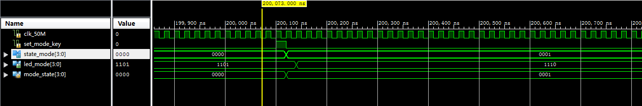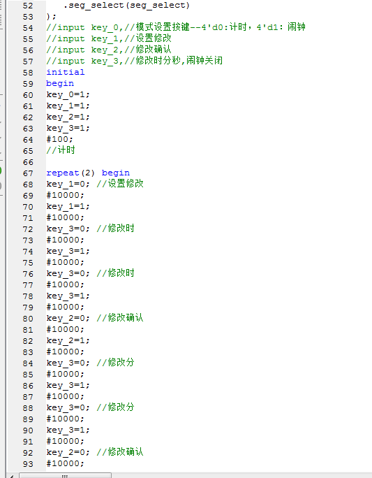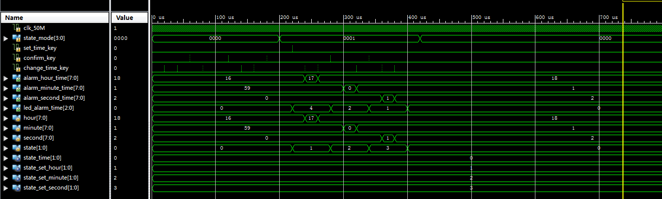 //设置闹钟模块 module alarm_clock( input clk_50M, input [3:0] state_mode,//当前模式,4'd0:计时,4'd1:闹钟 input set_time_key,//设置时间 input confirm_key,//确认 input change_time_key,//设置时分秒 output reg [2:0] led_alarm_time, output [7:0] alarm_hour_time,//时 output [7:0] alarm_minute_time,//分 output [7:0] alarm_second_time//秒 ); reg [7:0] hour=8'd16;//时 reg [7:0] minute=8'd59;//分 reg [7:0] second=8'd00;//秒 parameter state_time=2'd0;//正常计时状态 parameter state_set_hour=2'd1;//设置小时状态 parameter state_set_minute=2'd2;//设置小时状态 parameter state_set_second=2'd3;//设置秒状态 reg [1:0] state=state_time;//默认正常计时状态 always@(posedge clk_50M) if(state_mode==4'd1)//当前模式,4'd0:计时,4'd1:闹钟 case(state) state_time: if(set_time_key)//设置键按下,进入设置小时状态 state<=state_set_hour; else state<=state_time; state_set_hour: if(confirm_key)//确认键按下,进入设置分钟状态 state<=state_set_minute; else state<=state_set_hour; state_set_minute: if(confirm_key)//确认键按下,进入设置秒状态 state<=state_set_second; else state<=state_set_minute; state_set_second: if(confirm_key)//确认键按下,返回正常计时状态 state<=state_time; else state<=state_set_second; default:; endcase else state<=state_time; always@(posedge clk_50M) case(state) state_set_hour: led_alarm_time<=3'b100; state_set_minute: led_alarm_time<=3'b010; state_set_second: led_alarm_time<=3'b001; default:led_alarm_time<=3'b000; endcase always@(posedge clk_50M) case(state) state_set_hour: if(change_time_key) if(hour==8'd23) hour<=8'd0; else hour<=hour+8'd1; state_set_minute: if(change_time_key) if(minute==8'd59) minute<=8'd0; else minute<=minute+8'd1; state_set_second: if(change_time_key) if(second==8'd59) second<=8'd0; else second<=second+8'd1; default:; endcase assign alarm_hour_time=hour; assign alarm_minute_time=minute; assign alarm_second_time=second; endmodule