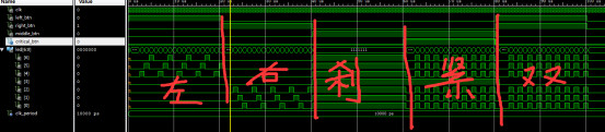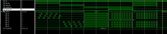 LIBRARY ieee; USE ieee.std_logic_1164.all; USE ieee.std_logic_unsigned.all; --尾灯控制模块 ENTITY backlight IS PORT ( clk : IN STD_LOGIC; left_btn : IN STD_LOGIC;--左转 right_btn : IN STD_LOGIC;--右转 middle_btn : IN STD_LOGIC;--刹车 critical_btn : IN STD_LOGIC;--紧急刹车 led : OUT STD_LOGIC_VECTOR(6 DOWNTO 0) ); END backlight; ARCHITECTURE trans OF backlight IS SIGNAL left_cnt : STD_LOGIC_VECTOR(1 DOWNTO 0) := "00"; SIGNAL left_light : STD_LOGIC_VECTOR(6 DOWNTO 0) := "0000000"; SIGNAL right_cnt : STD_LOGIC_VECTOR(1 DOWNTO 0) := "00"; SIGNAL right_light : STD_LOGIC_VECTOR(6 DOWNTO 0) := "0000000"; SIGNAL stop_cnt : STD_LOGIC_VECTOR(1 DOWNTO 0) := "00"; SIGNAL stop_light : STD_LOGIC_VECTOR(6 DOWNTO 0) := "0000000"; SIGNAL double_cnt : STD_LOGIC_VECTOR(1 DOWNTO 0) := "00"; SIGNAL double_light : STD_LOGIC_VECTOR(6 DOWNTO 0) := "0000000"; BEGIN PROCESS (clk) BEGIN IF (clk'EVENT AND clk = '1') THEN IF (left_btn = '1' AND right_btn = '0') THEN--左转时 left_cnt <= left_cnt + "01";--计数器累加 ELSE left_cnt <= "00"; END IF; END IF; END PROCESS; PROCESS (clk) BEGIN IF (clk'EVENT AND clk = '1') THEN CASE left_cnt IS WHEN "00" => left_light <= "0000000";--左边尾灯向左流水 WHEN "01" => left_light <= "0010000"; WHEN "10" => left_light <= "0100000"; WHEN "11" => left_light <= "1000000"; WHEN OTHERS => NULL; END CASE; END IF; END PROCESS; PROCESS (clk) BEGIN IF (clk'EVENT AND clk = '1') THEN IF (left_btn = '0' AND right_btn = '1') THEN--右转时 right_cnt <= right_cnt + "01";--计数器累加 ELSE right_cnt <= "00"; END IF; END IF; END PROCESS; PROCESS (clk) BEGIN IF (clk'EVENT AND clk = '1') THEN CASE right_cnt IS WHEN "00" => right_light <= "0000000";--右边尾灯右流水 WHEN "01" => right_light <= "0000100"; WHEN "10" => right_light <= "0000010"; WHEN "11" => right_light <= "0000001"; WHEN OTHERS => NULL; END CASE; END IF; END PROCESS; PROCESS (clk) BEGIN IF (clk'EVENT AND clk = '1') THEN IF (middle_btn = '1' AND critical_btn = '1') THEN--紧急刹车 stop_cnt <= stop_cnt + "01";--计数器累加 ELSE stop_cnt <= "00"; END IF; END IF; END PROCESS; PROCESS (clk) BEGIN IF (clk'EVENT AND clk = '1') THEN CASE stop_cnt IS WHEN "00" => stop_light <= "0001000";--中间亮,两边闪烁 WHEN "01" => stop_light <= "1111111"; WHEN "10" => stop_light <= "0001000"; WHEN "11" => stop_light <= "1111111"; WHEN OTHERS => NULL; END CASE; END IF; END PROCESS;