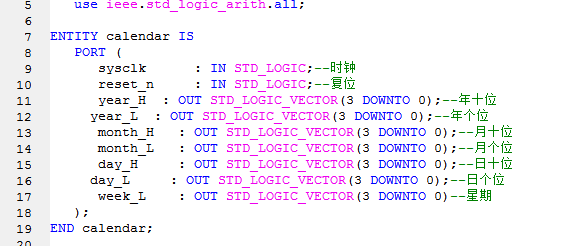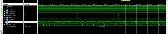 LIBRARY ieee; USE ieee.std_logic_1164.all; USE ieee.std_logic_unsigned.all; use ieee.std_logic_arith.all; ENTITY calendar IS PORT ( sysclk : IN STD_LOGIC;--时钟 reset_n : IN STD_LOGIC;--复位 year_H : OUT STD_LOGIC_VECTOR(3 DOWNTO 0);--年十位 year_L : OUT STD_LOGIC_VECTOR(3 DOWNTO 0);--年个位 month_H : OUT STD_LOGIC_VECTOR(3 DOWNTO 0);--月十位 month_L : OUT STD_LOGIC_VECTOR(3 DOWNTO 0);--月个位 day_H : OUT STD_LOGIC_VECTOR(3 DOWNTO 0);--日十位 day_L : OUT STD_LOGIC_VECTOR(3 DOWNTO 0);--日个位 week_L : OUT STD_LOGIC_VECTOR(3 DOWNTO 0)--星期 ); END calendar; ARCHITECTURE RTL OF calendar IS --2进制转BCD码 COMPONENT BCD IS PORT ( clk : IN STD_LOGIC; binary : IN STD_LOGIC_VECTOR(7 DOWNTO 0); Tens : OUT STD_LOGIC_VECTOR(3 DOWNTO 0); Ones : OUT STD_LOGIC_VECTOR(3 DOWNTO 0) ); END COMPONENT; SIGNAL year : STD_LOGIC_VECTOR(7 DOWNTO 0) := "00001000"; SIGNAL month : STD_LOGIC_VECTOR(3 DOWNTO 0) := "0001"; SIGNAL day : STD_LOGIC_VECTOR(4 DOWNTO 0) := "11110"; SIGNAL week : STD_LOGIC_VECTOR(3 DOWNTO 0) := "0001"; SIGNAL leap_month : STD_LOGIC;--闰月 signal div_cnt:Integer RANGE 0 to 100000; SIGNAL day_pulse : STD_LOGIC; --日脉冲 SIGNAL month_ex : STD_LOGIC_VECTOR(7 DOWNTO 0); SIGNAL day_ex : STD_LOGIC_VECTOR(7 DOWNTO 0); BEGIN PROCESS (sysclk) BEGIN IF (sysclk'EVENT AND sysclk = '1') THEN IF (div_cnt >= 100) THEN--仿真是将100000改小为100 --IF (div_cnt >= 100000) THEN--上板测试时为100000 div_cnt <= 0; day_pulse <= '1';--1秒变一次 ELSE div_cnt <= div_cnt + 1; day_pulse <= '0'; END IF; END IF; END PROCESS; --闰月判断 PROCESS (day, month , year) BEGIN IF ((day = "11100") AND NOT(((year(1 DOWNTO 0) = "00" AND year /= "00000000"))) AND (month = "0010")) THEN leap_month<='1'; ELSIF((day = "11101") AND ((year(1 DOWNTO 0) = "00" AND year /= "00000000")) AND (month = "0010"))THEN leap_month<='1'; ELSIF((day = "11110") AND ((month = "0100") OR (month = "0110") OR (month = "1001") OR (month = "1011")) )THEN leap_month<='1'; ELSIF((day = "11111") AND ((month = "0001") OR (month = "0011") OR (month = "0101") OR (month = "0111") OR (month = "1000") OR (month = "1010") OR (month = "1100")))THEN leap_month<='1'; ELSE leap_month<='0'; END IF; END PROCESS; PROCESS (sysclk, reset_n) BEGIN IF ((NOT(reset_n)) = '1') THEN--复位 day <= "00001";--1日 month <= "0001";--1月 year <= "00001010";--10 ELSIF (sysclk'EVENT AND sysclk = '1') THEN IF (day_pulse = '1') THEN IF (leap_month = '1') THEN day <= "00001"; IF (month = "1100") THEN month <= "0001"; IF (year = "01100011") THEN year <= "00000000"; ELSIF (month = "1100") THEN year <= year + "00000001"; END IF; ELSIF (leap_month = '1') THEN month <= month + "0001"; END IF; ELSE day <= day + "00001"; END IF; END IF; END IF; END PROCESS;