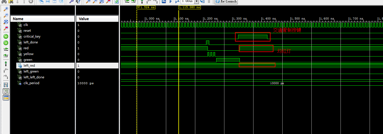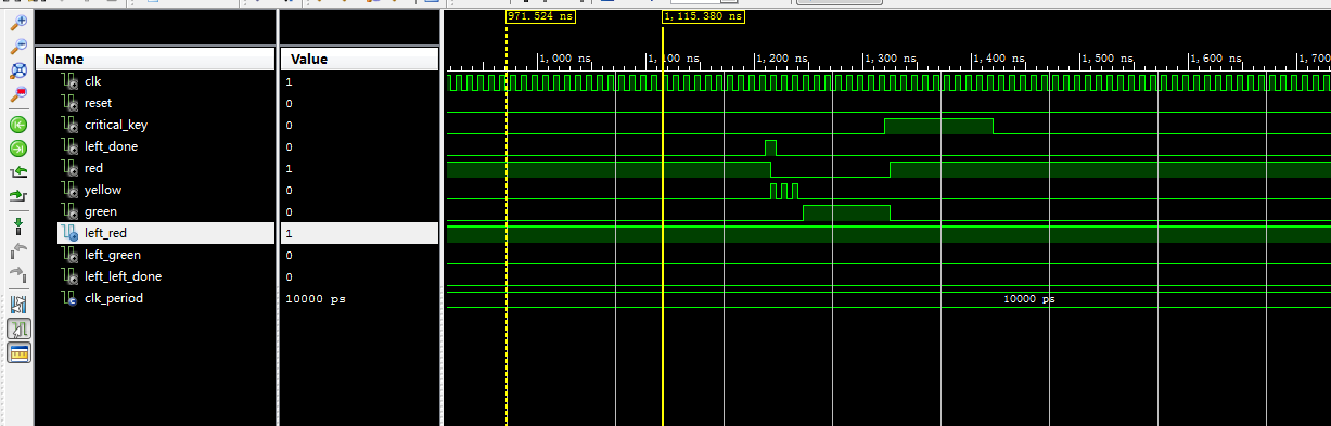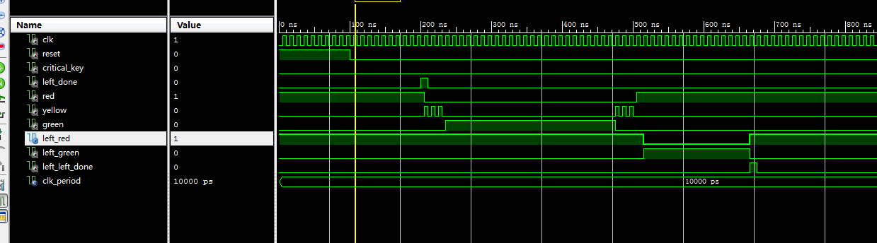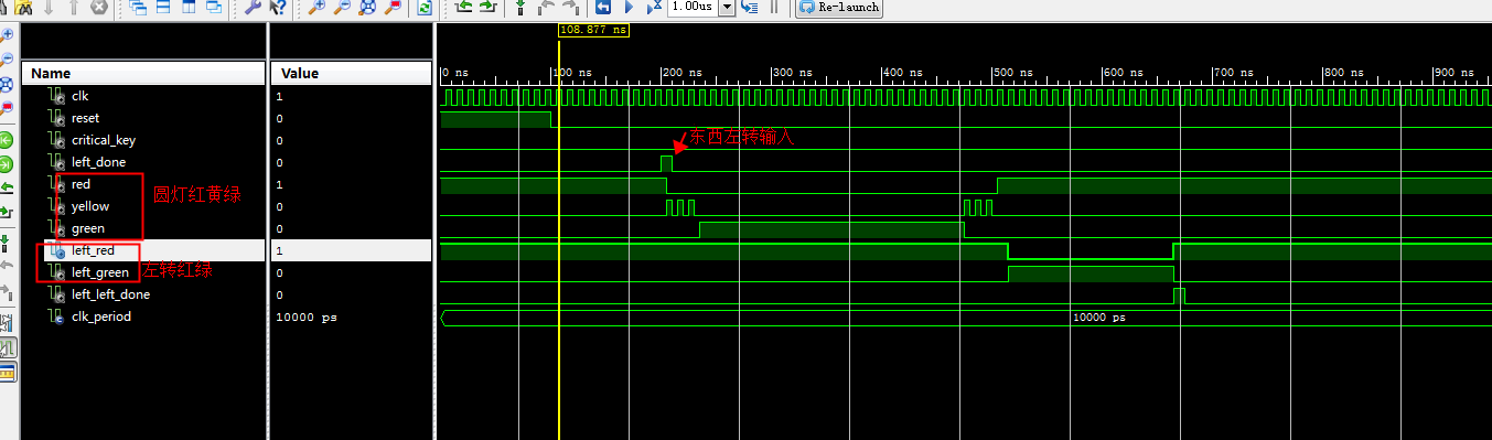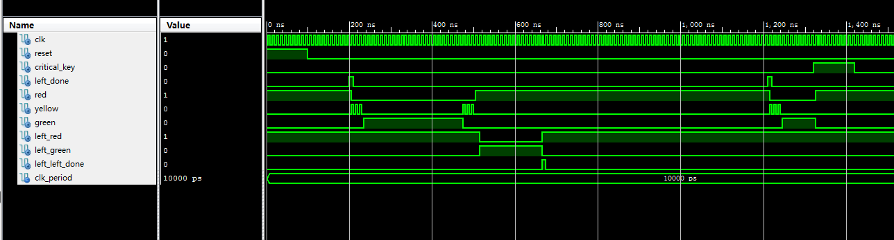 3.左转箭头灯:当接收到圆形指示灯的左转允许信号后,由红色跳转为绿色,维持15秒后跳转回红色,并输出一个左转完成信号;
