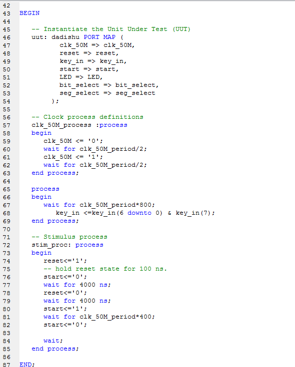 LIBRARY ieee; USE ieee.std_logic_1164.all; USE ieee.std_logic_unsigned.all; --分频模块 ENTITY fengping IS PORT ( clk_50M : IN STD_LOGIC; clk_div : OUT STD_LOGIC--50M分频为100KHz ); END fengping; ARCHITECTURE behave OF fengping IS SIGNAL count : integer:=0; BEGIN PROCESS (clk_50M) BEGIN IF (clk_50M'EVENT AND clk_50M = '1') THEN IF (count >= 499) THEN--计数到499,500分频 count <= 0; ELSE count <= count + 1; END IF; END IF; END PROCESS; PROCESS (clk_50M) BEGIN IF (clk_50M'EVENT AND clk_50M = '1') THEN IF (count >= 250) THEN--分频为clk_div clk_div <= '0'; ELSE clk_div <= '1'; END IF; END IF; END PROCESS; END behave;