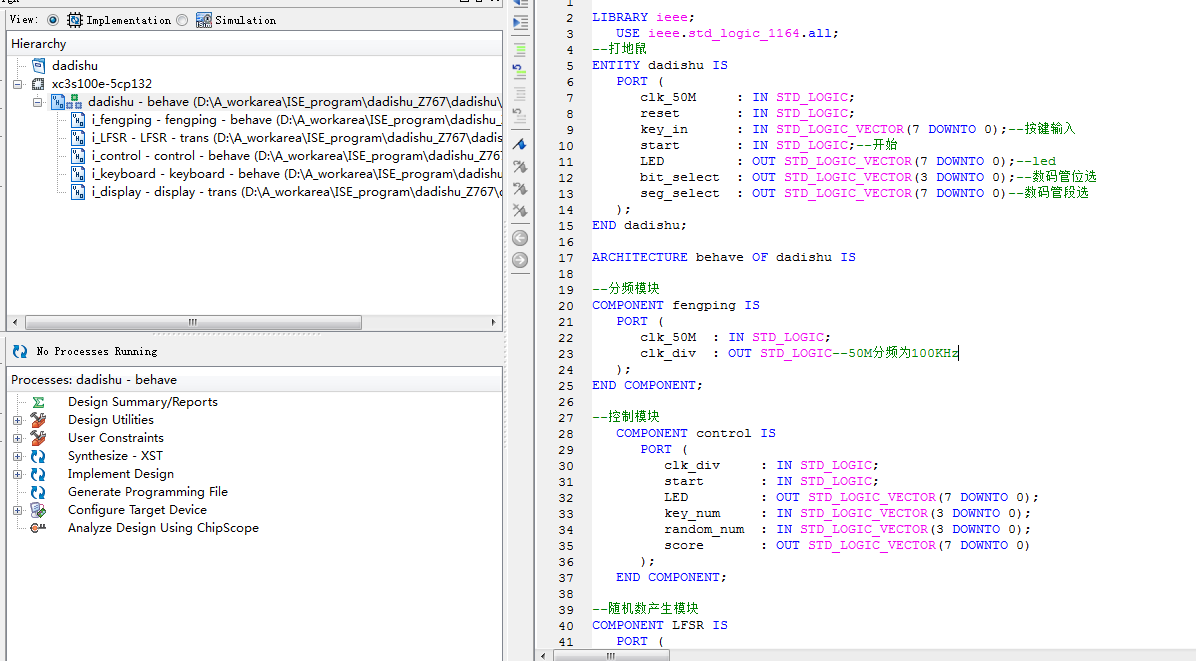 名称:基于FPGA的打地鼠游戏机设计VHDL代码ISE仿真