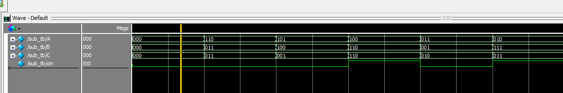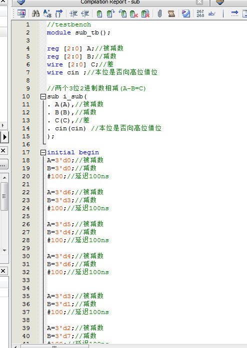 编写两个三位二进制数相减的 verilog程序并测试仿真。