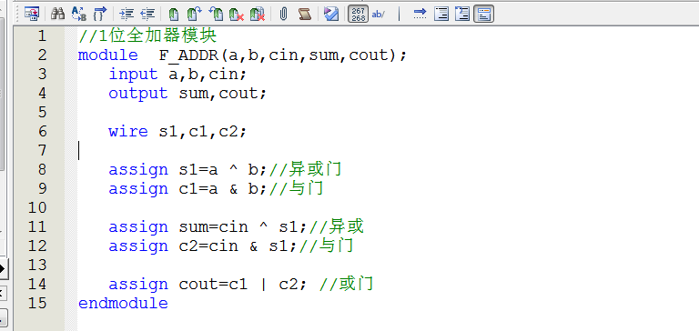 module add14bit(a,b,cin,sum,cout); input [13:0] a;//加数 input [13:0] b;//加数 input cin;//加数进位 output [13:0] sum;//和 output cout;//和进位 wire [13:0] T; //14个1位全加器级联,组成14位全加器 F_ADDR u1(.a(a[0]),.b(b[0]),.cin(cin) ,.sum(sum[0]),.cout(T[0])); F_ADDR u2(.a(a[1]),.b(b[1]),.cin(T[0]),.sum(sum[1]),.cout(T[1])); F_ADDR u3(.a(a[2]),.b(b[2]),.cin(T[1]),.sum(sum[2]),.cout(T[2])); F_ADDR u4(.a(a[3]),.b(b[3]),.cin(T[2]),.sum(sum[3]),.cout(T[3])); F_ADDR u5(.a(a[4]),.b(b[4]),.cin(T[3]),.sum(sum[4]),.cout(T[4])); F_ADDR u6(.a(a[5]),.b(b[5]),.cin(T[4]),.sum(sum[5]),.cout(T[5])); F_ADDR u7(.a(a[6]),.b(b[6]),.cin(T[5]),.sum(sum[6]),.cout(T[6])); F_ADDR u8(.a(a[7]),.b(b[7]),.cin(T[6]),.sum(sum[7]),.cout(T[7])); F_ADDR u9(.a(a[8]),.b(b[8]),.cin(T[7]),.sum(sum[8]),.cout(T[8])); F_ADDR u10(.a(a[9]),.b(b[9]),.cin(T[8]),.sum(sum[9]),.cout(T[9])); F_ADDR u11(.a(a[10]),.b(b[10]),.cin(T[9]),.sum(sum[10]),.cout(T[10])); F_ADDR u12(.a(a[11]),.b(b[11]),.cin(T[10]),.sum(sum[11]),.cout(T[11])); F_ADDR u13(.a(a[12]),.b(b[12]),.cin(T[11]),.sum(sum[12]),.cout(T[12])); F_ADDR u14(.a(a[13]),.b(b[13]),.cin(T[12]),.sum(sum[13]),.cout(cout)); endmodule
