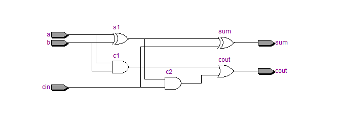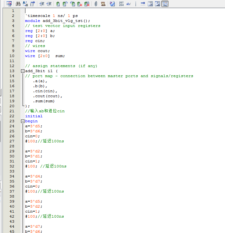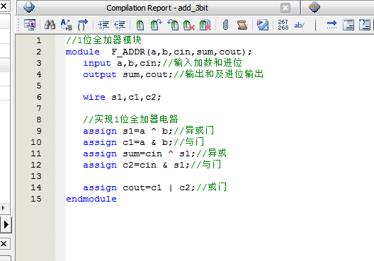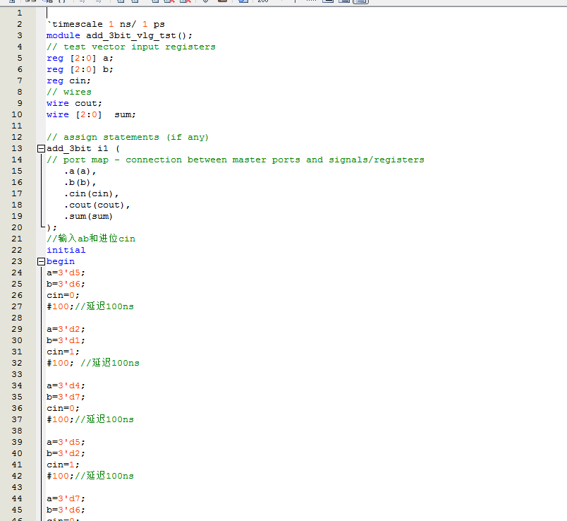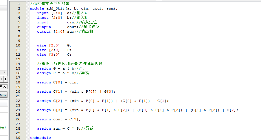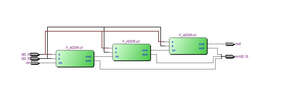 //3bit串行进位全加器 module add_3bit(a,b,cin,sum,cout); input [2:0] a;//加数 input [2:0] b;//加数 input cin;//加数进位 output [2:0] sum;//和 output cout;//和进位 wire [2:0] T;//中间信号 //3个1位全加器串行进位,组成3位全加器 F_ADDR u1(.a(a[0]),.b(b[0]),.cin(cin) ,.sum(sum[0]),.cout(T[0])); F_ADDR u2(.a(a[1]),.b(b[1]),.cin(T[0]),.sum(sum[1]),.cout(T[1])); F_ADDR u3(.a(a[2]),.b(b[2]),.cin(T[1]),.sum(sum[2]),.cout(cout)); endmodule