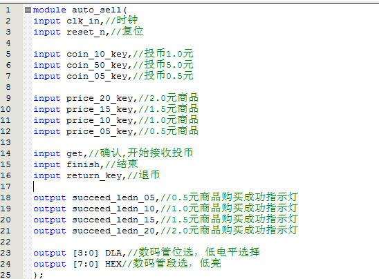 module auto_sell( input clk_in,//时钟 input reset_n,//复位 input coin_10_key,//投币1.0元 input coin_50_key,//投币5.0元 input coin_05_key,//投币0.5元 input price_20_key,//2.0元商品 input price_15_key,//1.5元商品 input price_10_key,//1.0元商品 input price_05_key,//0.5元商品 input get,//确认,开始接收投币 input finish,//结束 input return_key,//退币 output succeed_ledn_05,//0.5元商品购买成功指示灯 output succeed_ledn_10,//1.0元商品购买成功指示灯 output succeed_ledn_15,//1.5元商品购买成功指示灯 output succeed_ledn_20,//2.0元商品购买成功指示灯 output [3:0] DLA,//数码管位选,低电平选择 output [7:0] HEX//数码管段选,低亮 ); wire [7:0] input_money_BCD;//投币金额 wire [7:0] change_money_BCD;//找钱 wire coin_10_p;//投币1.0元 wire coin_50_p;//投币5.0元 wire coin_05_p;//投币0.5元 //按键上升沿检测模块 key_jitter i0_key_jitter( . clkin(clk_in), . key_in(coin_10_key),//输入 . key_posedge(coin_10_p)//按键上升沿检测 ); //按键上升沿检测模块 key_jitter i1_key_jitter( . clkin(clk_in), . key_in(coin_50_key),//输入 . key_posedge(coin_50_p)//按键上升沿检测 ); //按键上升沿检测模块 key_jitter i2_key_jitter( . clkin(clk_in), . key_in(coin_05_key),//输入 . key_posedge(coin_05_p)//按键上升沿检测 ); //状态控制模块 state_ctrl i_state_ctrl( . clk_in(clk_in),//时钟100Hz . reset_n(reset_n),//系统复位 . coin_10_p(coin_10_p),//投币1.0元 . coin_50_p(coin_50_p),//投币5.0元 . coin_05_p(coin_05_p),//投币0.5元 . price_20_p(price_20_key),//2.0元商品 . price_15_p(price_15_key),//1.5元商品 . price_10_p(price_10_key),//1.0元商品 . price_05_p(price_05_key),//0.5元商品 . return_p(return_key),//退币键 . get(get),//确认 . finish(finish), . succeed_ledn_05(succeed_ledn_05),//0.5元商品购买成功指示灯 . succeed_ledn_10(succeed_ledn_10),//1.0元商品购买成功指示灯 . succeed_ledn_15(succeed_ledn_15),//1.5元商品购买成功指示灯 . succeed_ledn_20(succeed_ledn_20),//2.0元商品购买成功指示灯 . input_money_BCD(input_money_BCD),//投币金额 . change_money_BCD(change_money_BCD)//找钱 ); //数码管显示模块 display_num i_display_num( . clk_in(clk_in),//100Hz . input_money_BCD(input_money_BCD),//投币金额 . change_money_BCD(change_money_BCD),//找钱 . DLA(DLA),//数码管位选,低电平选择 . HEX(HEX)//数码管段选,低亮 ); endmodule