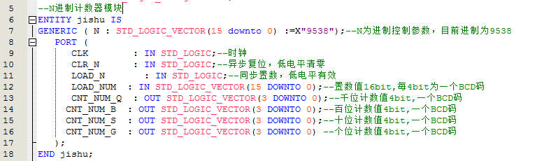 LIBRARY ieee; USE ieee.std_logic_1164.all; USE ieee.std_logic_unsigned.all; --N进制计数器模块 ENTITY jishu IS GENERIC ( N : STD_LOGIC_VECTOR(15 downto 0) :=X"9538");--N为进制控制参数,目前进制为9538 PORT ( CLK : IN STD_LOGIC;--时钟 CLR_N : IN STD_LOGIC;--异步复位,低电平清零 LOAD_N : IN STD_LOGIC;--同步置数,低电平有效 LOAD_NUM : IN STD_LOGIC_VECTOR(15 DOWNTO 0);--置数值16bit,每4bit为一个BCD码 CNT_NUM_Q : OUT STD_LOGIC_VECTOR(3 DOWNTO 0);--千位计数值4bit,一个BCD码 CNT_NUM_B : OUT STD_LOGIC_VECTOR(3 DOWNTO 0);--百位计数值4bit,一个BCD码 CNT_NUM_S : OUT STD_LOGIC_VECTOR(3 DOWNTO 0);--十位计数值4bit,一个BCD码 CNT_NUM_G : OUT STD_LOGIC_VECTOR(3 DOWNTO 0) --个位计数值4bit,一个BCD码 ); END jishu; ARCHITECTURE RTL OF jishu IS signal NUMBER : STD_LOGIC_VECTOR(15 DOWNTO 0) := X"0000";--定义内部变量 BEGIN --进程 PROCESS (CLK, CLR_N) --variable NUMBER : STD_LOGIC_VECTOR(15 DOWNTO 0) <= X"0000";--定义内部变量 BEGIN IF (CLR_N = '0') THEN NUMBER <= X"0000";--异步复位,低电平清零 ELSIF (CLK'EVENT AND CLK = '1') THEN IF (LOAD_N = '0') THEN--同步置数,低电平有效 NUMBER <= LOAD_NUM;--置数值 ELSIF (NUMBER >= N) THEN--是否计数到对应进制值 NUMBER <= X"0000"; --回到0000 ELSIF (NUMBER(11 DOWNTO 0) = X"999") THEN--计数到999 NUMBER(15 DOWNTO 12) <= NUMBER(15 DOWNTO 12) + X"1";--千位加1 NUMBER(11 DOWNTO 0) <= X"000";--回到000 ELSIF (NUMBER(7 DOWNTO 4) = X"9" AND NUMBER(3 DOWNTO 0) = X"9") THEN--计数到99 NUMBER(11 DOWNTO 8) <= NUMBER(11 DOWNTO 8) + X"1";--百位加1 NUMBER(7 DOWNTO 0) <= X"00";--回到00 ELSIF (NUMBER(3 DOWNTO 0) = X"9") THEN--计数到9 NUMBER(7 DOWNTO 4) <= NUMBER(7 DOWNTO 4) + X"1";--十位加1 NUMBER(3 DOWNTO 0) <= X"0";--个位回到0 ELSE NUMBER(3 DOWNTO 0) <= NUMBER(3 DOWNTO 0) + X"1";--个位加1 END IF;