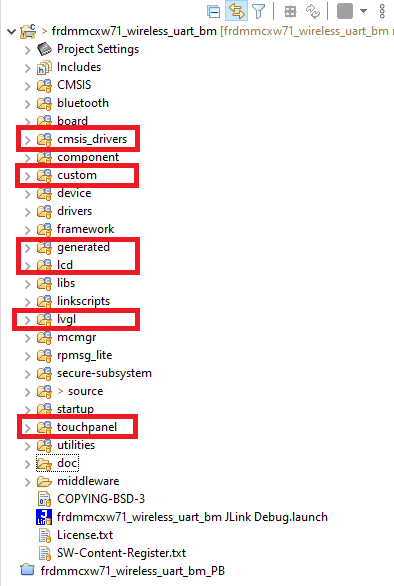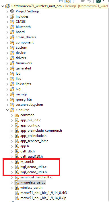 您的无线 UART 项目中必须导入 LVGL 文件夹中存在但不存在于无线 UART 中的文件夹和文件。例如,必须导入以下内容:
