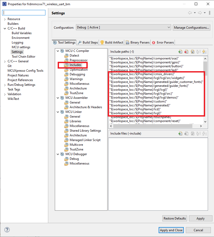 在 MCUXpresso IDE 中,导航至“项目”>“属性”。前往“C/C++ 构建”>“设置”>“工具设置”>“MCU C 编译器”>“包含”。点击“包含路径”文本框旁边的图标:
