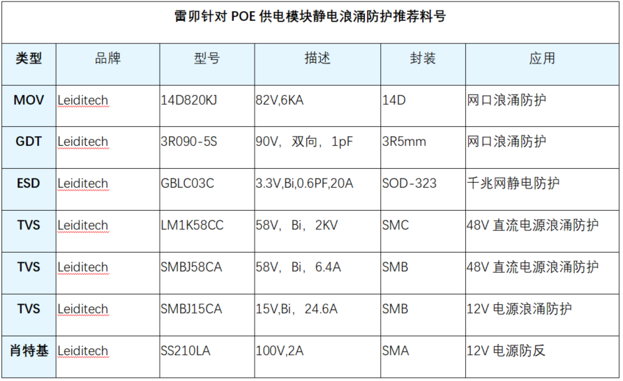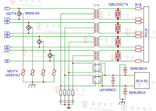 Leiditech 雷卯电子致力于成为电磁兼容解决方案和元器件供应领导品牌,供应 ESD(如 GBLC03C)、TVS、TSS、GDT(如 3R090-5S)、MOV、MOSFET、Zener、电感等产品。雷卯拥有经验丰富的研发团队,可根据不同应用场景(户外 / 室内、PoE / 非 PoE)提供个性化防护方案,为千兆设备接口安全保驾护航。