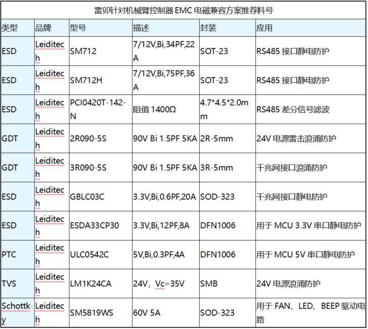 机械臂高速运转时,控制器温度飙升易导致宕机。雷卯方案用 “智能温控 + 高效器件” 双管齐下: