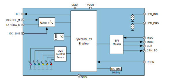 如上图示多光谱传感器芯片接口主要包含电源输入口VCC,信号接口I2C/UART,及外部接口(USB/以太网)。