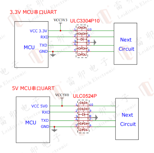 UART接口:雷卯采用单颗器件防护,节约空间, 保证信号完整性,ULC3304P10,ULC0524P,满足IEC61000-4-2,等级4,接触放电30kV,空气放电30kV。