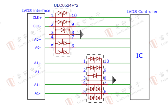 LVDS接口提供655Mbit/s的传输速度,本方案采用集成器件防护,寄生电容<1pf, 保证信号完整性,满足IEC61000-4-2,等级4,接触放电8kV,空气放电15kV。