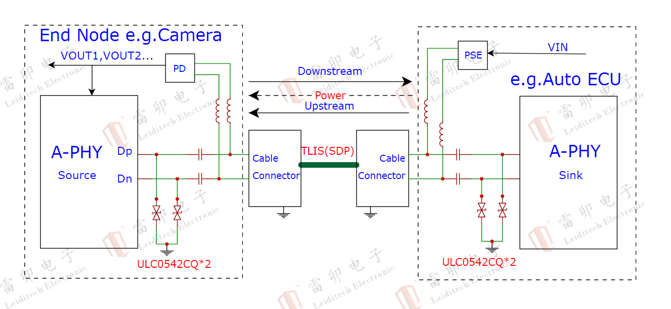 单端系统模式是由一根同轴电缆组成,同轴电缆上可以传输12V电源,主要用于车载摄像头,雷卯采用ULC1811CDNQ,Cj=0.3pF(Typ.)低结电容,保证信号完整性,满足IEC61000-4-2,等级4,接触放电15kV,空气放电25kV。