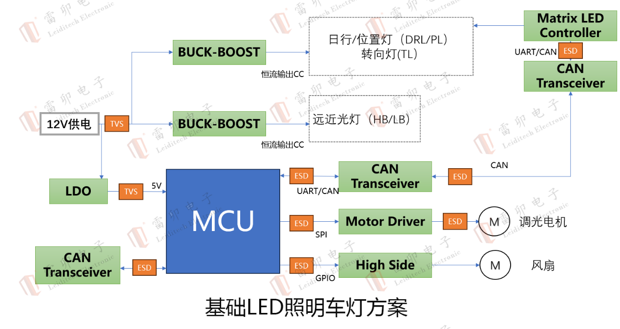 采用一级架构(单DCDC控制器+MOS管),支持远光/近光灯、转向灯、日行位置灯等基础需求。
