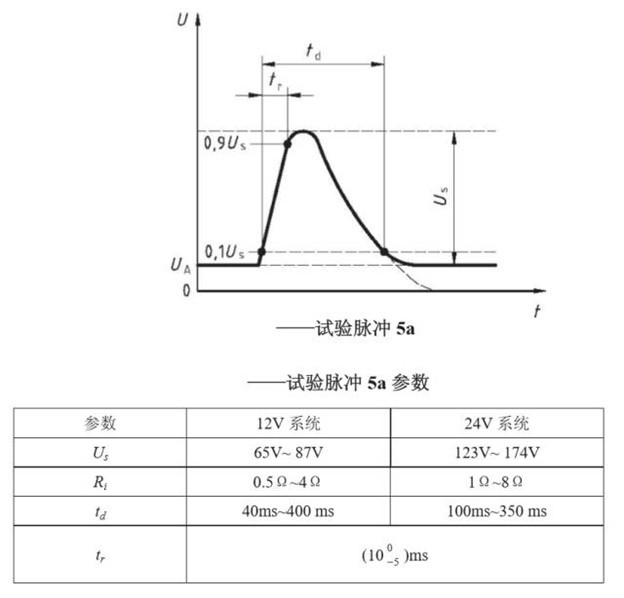 规定12V电气系统和24V电气系统的道路车辆沿电源线的电传导骚扰及其抗扰度的试验等级和测量方法。其中脉冲波形5A和5B两种标准测试是最具破坏性测试试验,也是最难通过的测试标准。