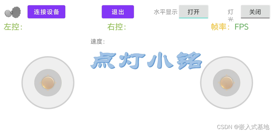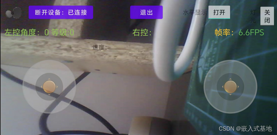 - APP具有IP设置、连接设备、退出、水平/横屏显示切换、灯光控制、左右摇杆控制、帧率显示、左右摇杆角度与速度显示功能
