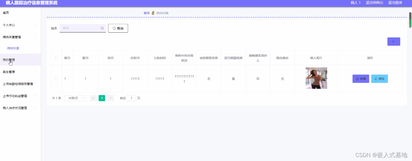 病例采集管理,在病例采集管理页面可以查看账号、姓名、住院号、入院时间、病程中所出现状况、家族聚集发病、是否核酸检测、接触湖北省内人、既往病史、病人照片等详细内容,进行详情、修改,如图所示。