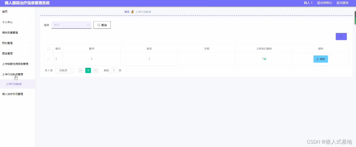 病人登录进入病人跟踪治疗信息管理系统可以查看首页、个人中心、病例采集管理、预约管理、医生管理、上传核酸检测报告管理、上传行动轨迹管理、病人治疗状况管理等内容。