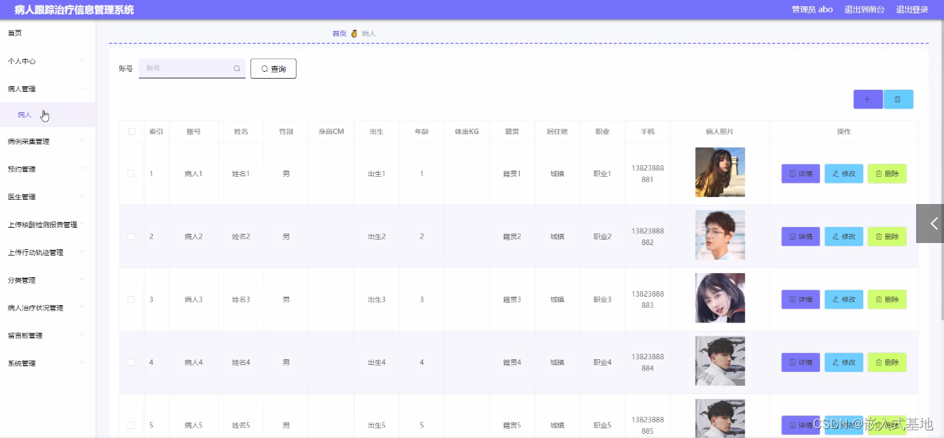 - 管理员:首页、个人中心、病人管理、病例采集管理、预约管理、医生管理、上传核酸检测报告管理、上传行动轨迹管理、分类管理、病人治疗状况管理、留言板管理、系统管理。