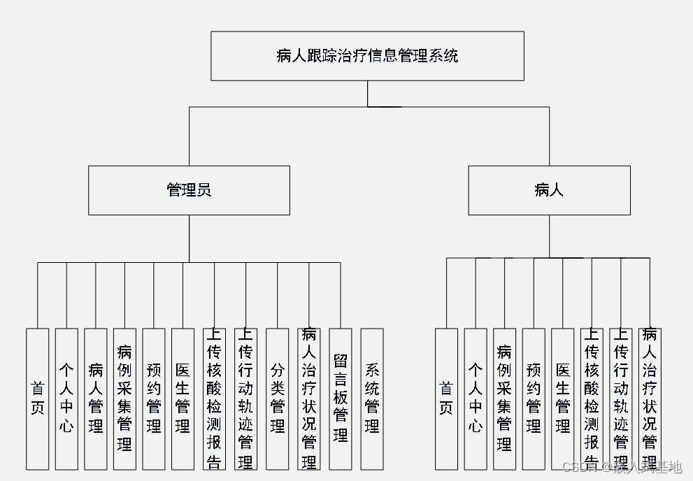 - 病人:首页、个人中心、病例采集管理、预约管理、医生管理、上传核酸检测报告管理、上传行动轨迹管理、病人治疗状况管理。