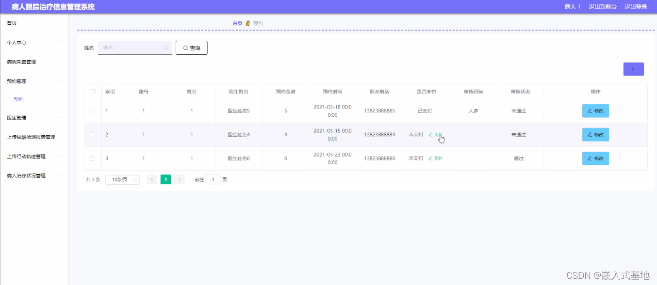 预约管理,在预约管理页面可以查看账号、姓名、医生姓名、预约金额、预约时间、联系电话、是否支付、审核回复、审核状态、审核等详细内容,进行详情、修改如图所示。
