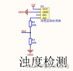 - 该款模块具有模拟量和数字量输出接口。模拟量可通过单片机 A/D 转换器进行采样处理,以获知当前水的污浊度。数字量可通过模块上的电位器调节触发阈值,当浊度达到设置好的阈值后,D1 指示灯会被点亮,传感器模块输出由高电平变成低电平,单片机通过监测电平的变化,判断水的浊度是否超标,从而预警或者联动其他设备。