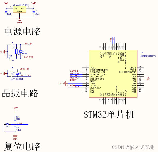STM32单片机最小系统电路由复位电路、时钟电路和电源电路。拥有这三部分电路后,单片机即可正常工作。
