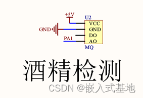 - 酒精传感器输出的是模拟信号,这里需要使用AD模块将模拟信号转换为数字信号给单片机,电路图如下: