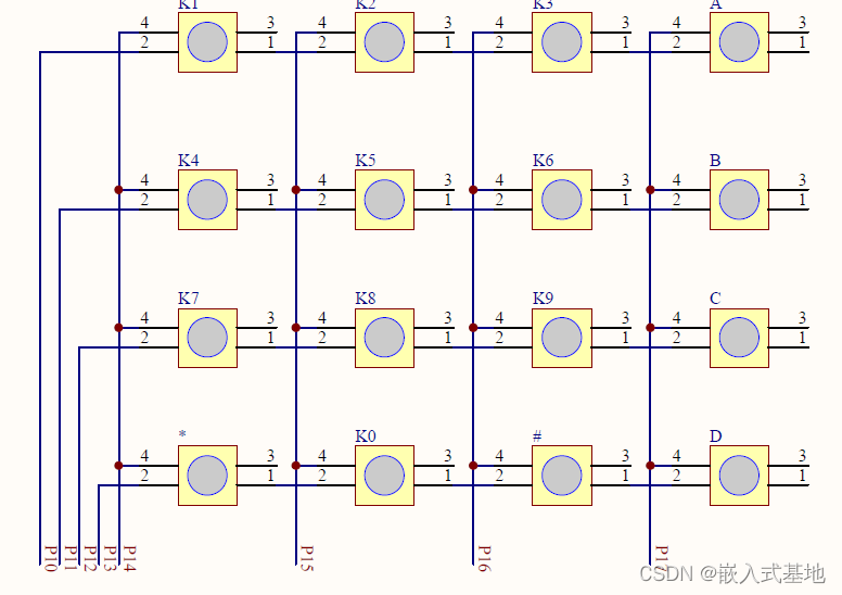 矩阵式键盘由行线和列线组成,按键位于行、列的交叉点上。当键被按下时,其交点的行线和列线接通,相应的行线或列线上的电平发生变化,单片机通过检测行或列线上的电平变化可以确定哪个按键被按下。
