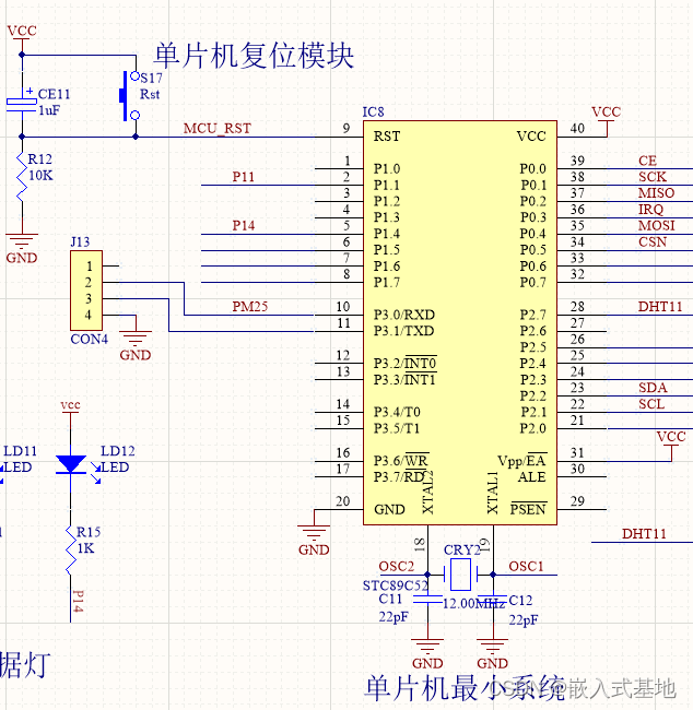 STC89C52单片机最小系统电路由复位电路、时钟电路和电源电路。拥有这三部分电路后,单片机即可正常工作。