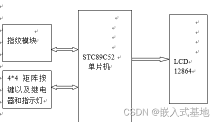 本设计由STC89C52RC单片机最小系统+指纹模块电路+矩阵按键电路+AT24C02+LCD12864液晶显示屏电路构成。