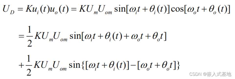 公式中的ωO 为压控振荡器在输入控制电压为零或为直流电压时的振荡角频率,称为电路的固有振荡角频率。则模拟乘法器的输出电压UD 为: