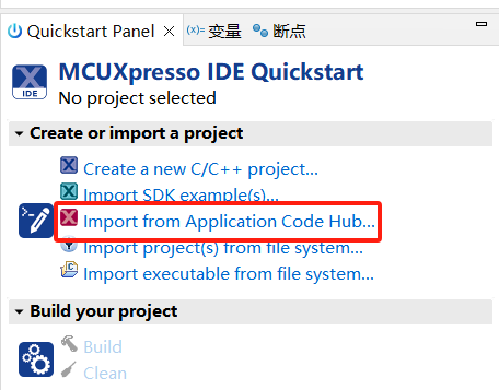 - 打开 MCUXpresso IDE,在快速启动面板中,选择从应用程序代码中心导入