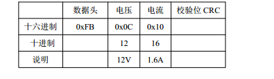 如上图: 0xFB 为数据头, 0x0C 为电压 12V, 0x10 为电流 1.6A