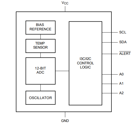 P3T1755 是一款温度数字转换器,工作温度范围为 -40 °C 至 +125 °C。它采用片上带隙温度传感器和模数转换技术,并具有过温检测功能。该器件包含多个配置和数据寄存器,用于存储器件设置(例如器件工作模式),以及一个温度寄存器 (Temp),用于存储数字温度读数,控制器可以通过双线串行 I3C(最高 12.5 MHz)和 I2C(最高 3.4 MHz)接口传输该读数。