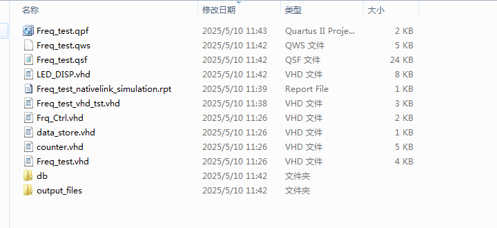 ·显示模块(LED_DISP)将锁存的频率值转换为数码管显示格式,驱动8位数码管显示。 各模块通过信号线连接,协同完成频率测量和显示。整体设计结构清晰,易于扩展和维护。