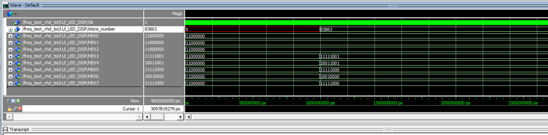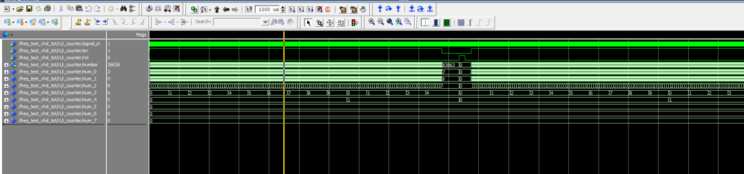 LIBRARY ieee; USE ieee.std_logic_1164.all; USE ieee.std_logic_unsigned.all; --计数器模块 ENTITY counter IS PORT ( signal_in : IN STD_LOGIC;--被测信号 en : IN STD_LOGIC;--1S闸门信号 rst : IN STD_LOGIC; number : OUT STD_LOGIC_VECTOR(31 DOWNTO 0)--频率值 ); END counter; ARCHITECTURE behavioral OF counter IS SIGNAL num_0 : STD_LOGIC_VECTOR(3 DOWNTO 0) := "0000"; SIGNAL num_1 : STD_LOGIC_VECTOR(3 DOWNTO 0) := "0000"; SIGNAL num_2 : STD_LOGIC_VECTOR(3 DOWNTO 0) := "0000"; SIGNAL num_3 : STD_LOGIC_VECTOR(3 DOWNTO 0) := "0000"; SIGNAL num_4 : STD_LOGIC_VECTOR(3 DOWNTO 0) := "0000"; SIGNAL num_5 : STD_LOGIC_VECTOR(3 DOWNTO 0) := "0000"; SIGNAL num_6 : STD_LOGIC_VECTOR(3 DOWNTO 0) := "0000"; SIGNAL num_7 : STD_LOGIC_VECTOR(3 DOWNTO 0) := "0000"; BEGIN number <= (num_7 & num_6 & num_5 & num_4 & num_3 & num_2 & num_1 & num_0);--单位Hz --计数,计数1s内的信号周期数,计数值就是频率值 PROCESS (signal_in, rst) BEGIN IF (rst = '1') THEN num_0 <= "0000"; num_1 <= "0000"; num_2 <= "0000"; num_3 <= "0000"; num_4 <= "0000"; num_5 <= "0000"; num_6 <= "0000"; num_7 <= "0000"; ELSIF (signal_in'EVENT AND signal_in = '1') THEN IF (en = '1') THEN--计数,低位都是9,则高位加1,低位清零,例如加到9999,则变为10000 IF (num_6 = "1001" AND num_5 = "1001" AND num_4 = "1001" AND num_3 = "1001" AND num_2 = "1001" AND num_1 = "1001" AND num_0 = "1001") THEN num_0 <= "0000"; num_1 <= "0000"; num_2 <= "0000"; num_3 <= "0000"; num_4 <= "0000"; num_5 <= "0000"; num_6 <= "0000"; num_7 <= num_7 + "0001";--低位为9,则高位加1,低位清零 ELSIF (num_5 = "1001" AND num_4 = "1001" AND num_3 = "1001" AND num_2 = "1001" AND num_1 = "1001" AND num_0 = "1001") THEN num_0 <= "0000"; num_1 <= "0000"; num_2 <= "0000"; num_3 <= "0000"; num_4 <= "0000"; num_5 <= "0000"; num_6 <= num_6 + "0001";--低位为9,则高位加1,低位清零 num_7 <= num_7; ELSIF (num_4 = "1001" AND num_3 = "1001" AND num_2 = "1001" AND num_1 = "1001" AND num_0 = "1001") THEN num_0 <= "0000"; num_1 <= "0000"; num_2 <= "0000"; num_3 <= "0000"; num_4 <= "0000"; num_5 <= num_5 + "0001";--低位为9,则高位加1,低位清零 num_6 <= num_6; num_7 <= num_7; ELSIF (num_3 = "1001" AND num_2 = "1001" AND num_1 = "1001" AND num_0 = "1001") THEN num_0 <= "0000"; num_1 <= "0000"; num_2 <= "0000"; num_3 <= "0000"; num_4 <= num_4 + "0001";--低位为9,则高位加1,低位清零 num_5 <= num_5; num_6 <= num_6; num_7 <= num_7; ELSIF (num_2 = "1001" AND num_1 = "1001" AND num_0 = "1001") THEN num_0 <= "0000"; num_1 <= "0000"; num_2 <= "0000"; num_3 <= num_3 + "0001";--低位为9,则高位加1,低位清零 num_4 <= num_4; num_5 <= num_5; num_6 <= num_6; num_7 <= num_7; ELSIF (num_1 = "1001" AND num_0 = "1001") THEN num_0 <= "0000"; num_1 <= "0000"; num_2 <= num_2 + "0001";--低位为9,则高位加1,低位清零 num_3 <= num_3; num_4 <= num_4; num_5 <= num_5; num_6 <= num_6; num_7 <= num_7; ELSIF (num_0 = "1001") THEN num_0 <= "0000"; num_1 <= num_1 + "0001";--低位为9,则高位加1,低位清零 num_2 <= num_2; num_3 <= num_3; num_4 <= num_4; num_5 <= num_5; num_6 <= num_6; num_7 <= num_7; ELSE num_0 <= num_0 + "0001";--低位加1 num_1 <= num_1; num_2 <= num_2; num_3 <= num_3; num_4 <= num_4; num_5 <= num_5; num_6 <= num_6; num_7 <= num_7; END IF; END IF; END IF; END PROCESS; END behavioral;