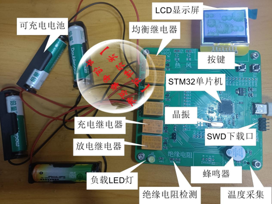 1.充放电管理:单片机控制充放电继电器,对电池的充放电进行管理。