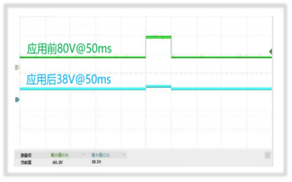 针对浪涌测试:模块可在50ms内将 80V~100V的瞬态浪涌电压钳位至 38V(应用实测数据),低于标准规定的 “负载安全电压阈值”,避免 DC-DC 变换器、传感器被击穿;