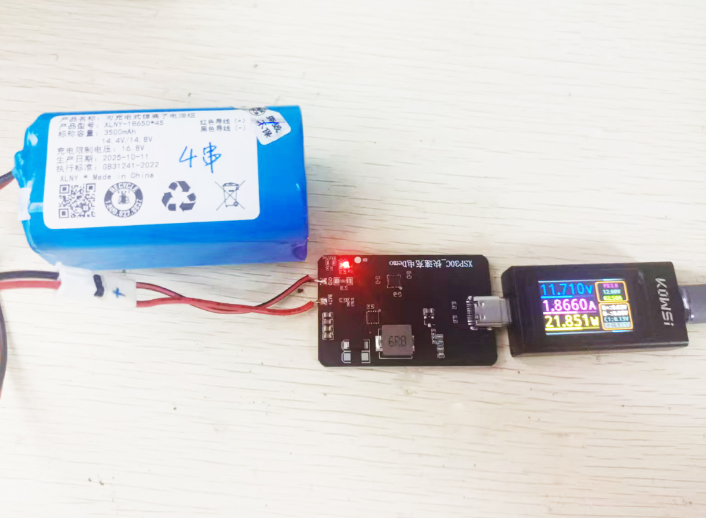 使用XSP30D电路给4串16.8V容量为3200mAh锂电池充电,使用PD充电器,充电电流最大1.9A,充满电16.60V 充满电只需2小时30分左右