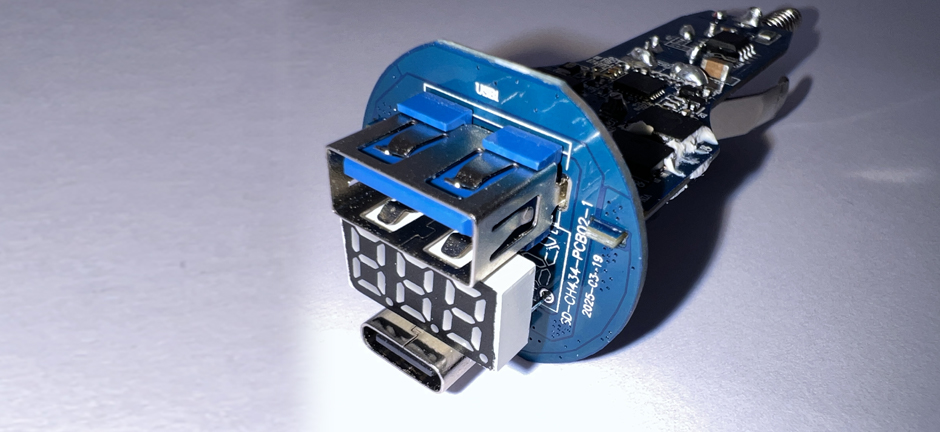 输出端圆形PCB焊接USB-C和USB-A母座。配备1A1C双接口,两个接口间还设有数显屏,能为高级感的外观继续加分。