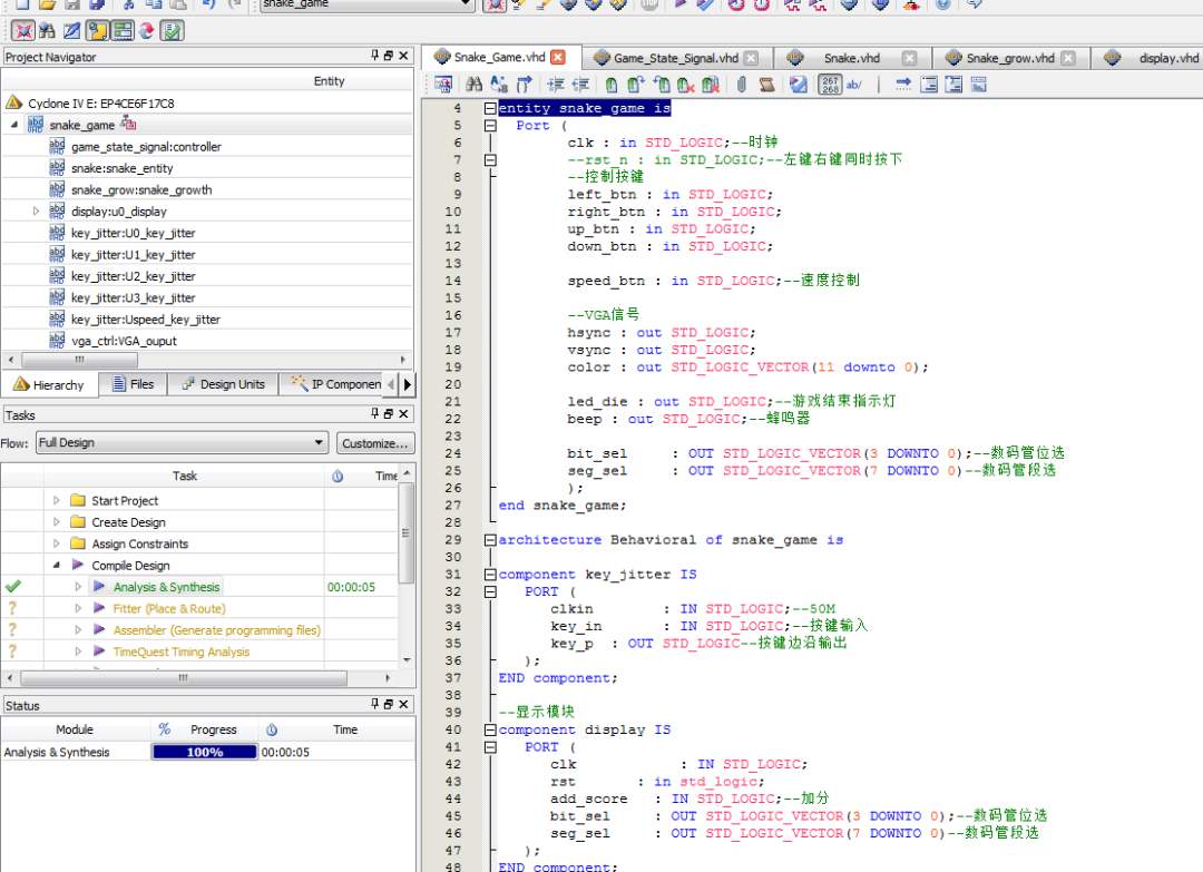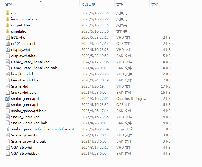 ·snake_game.vhd:顶层实体,实例化各子模块,处理按键、时钟分频及外设信号分配。