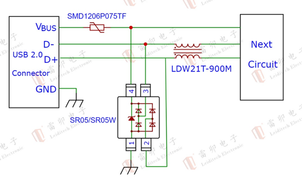 雷卯采用单颗器件SR05W防护USB2.0接口,节约空间,保证信号完整性,满足IEC61000-4-2,等级4,接触放电±8kV,空气放电±15kV,保证工业客户的各种电气干扰。如对Vbus有过流要求,需搭配PTC实现 “过压 + 过流” 双重保护。