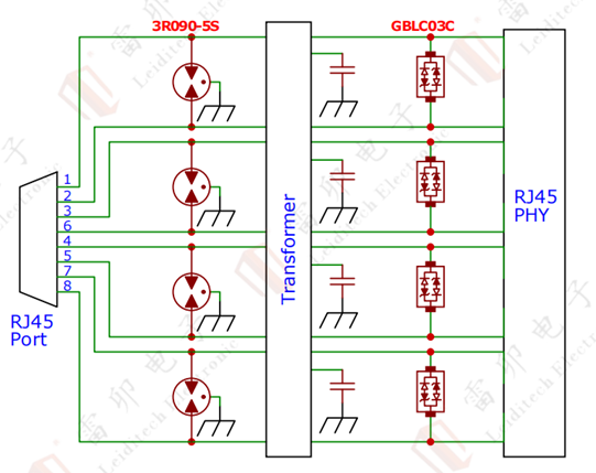 - 二级钳位:每对差分线并联雷卯GBLC03C ESD二极管(SOD-323 封装),钳位电压≤20V(适配 TI DP83848、微芯 LAN8742 等 PHY 芯片耐压),单路电容仅0.6pF,无信号畸变;
