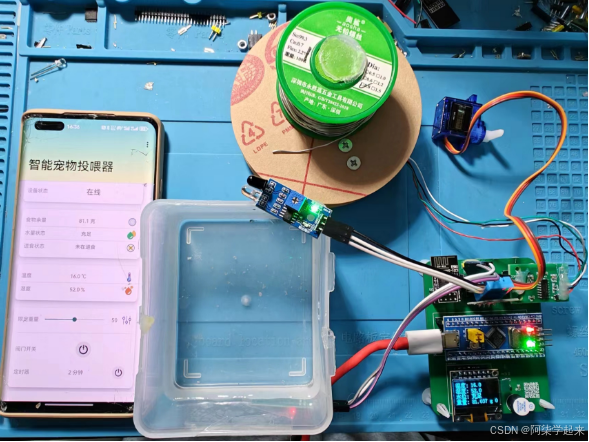 - 使用舵机控制食物阀门的开关,可使用APP进行远程手动调节
