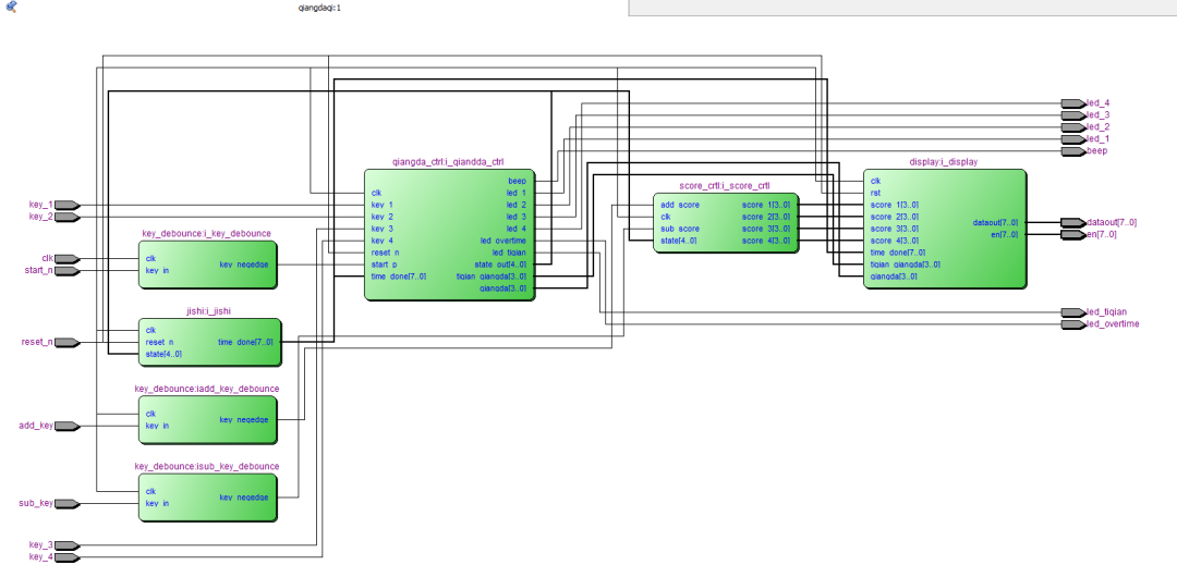 (3)在FPGA通过并行处理逻辑,检测到按键被按下的瞬间后,启动一个定时器。这个过程能够指明哪个按钮最早被触发,从而确定抢答的优先级。这可以通过设置一个状态机来实现跟踪每个按钮的按下状态,并计算按下的时间[10]。一旦确定顺序,系统可以生成相应的信号,便于后续处理。