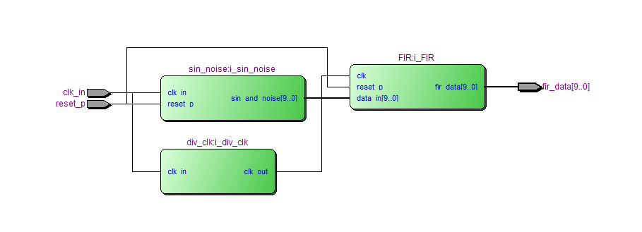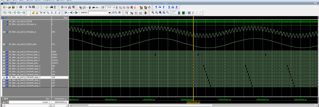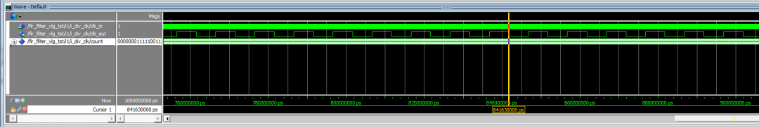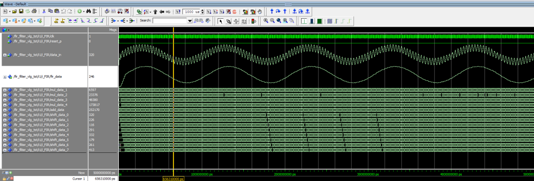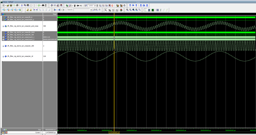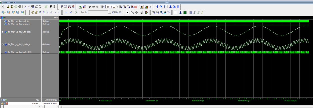 上图中,data_in为输入的30KHz和1KHz正弦波信号叠加的测试信号,输出fir_data为滤波后的信号,可以看到30KHz信号被滤除,1KHz信号被保留,验证功能正确。